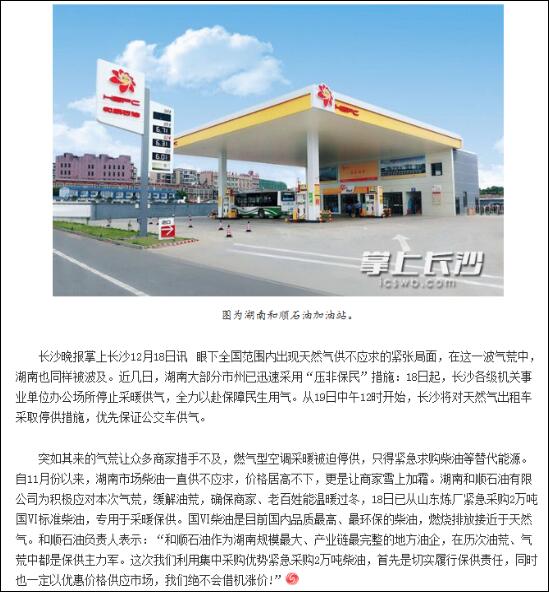 近幾日,湖南部分市州已迅速采取“壓非保民”措施,停止了眾多商家及出租車的燃?xì)夤?yīng)。突如其來(lái)的氣荒讓大家措手不及。為了確保市場(chǎng)供油穩(wěn)定,讓星城人民溫暖過(guò)冬,順暢出行,和順石油積極應(yīng)對(duì),從山東緊急采購(gòu)2萬(wàn)噸國(guó)VI標(biāo)準(zhǔn)柴油,專門用于市場(chǎng)保供,切實(shí)履行企業(yè)社會(huì)責(zé)任,同時(shí)以優(yōu)惠價(jià)格供應(yīng)市場(chǎng),絕不借機(jī)漲價(jià)。